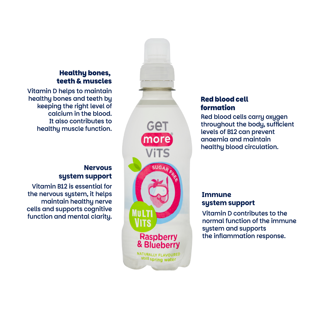 Fruity, refreshing and full of goodness. Our Raspberry & Blueberry Multivits drinks are the perfect healthier alternative for picnics, lunchboxes or hydration on the go. Sweet raspberry pairs with tangy blueberry natural flavours, blended with spring water and 50%* of a child's daily dose of vitamins. Healthy never tasted so good!