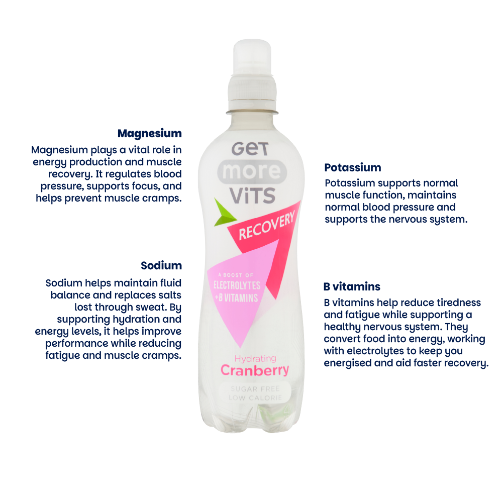 Our thirst-quenching, fruity Cranberry flavoured water is packed with electrolytes to aid hydration and B Vits to help your body recover from exercise or illness. Electrolytes rehydrate the body faster than water, making our Recovery Cranberry drink to perfect sugar-free sports drink. Healthy never tasted so good!