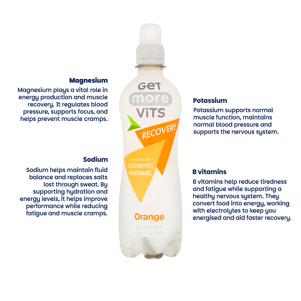 Our thirst-quenching, fruity Orange flavoured water is packed with electrolytes to aid hydration and B Vits to help your body recover from exercise or illness. Electrolytes rehydrate the body faster than water, making our Recovery Orange drink to perfect sugar-free sports drink. Healthy never tasted so good!